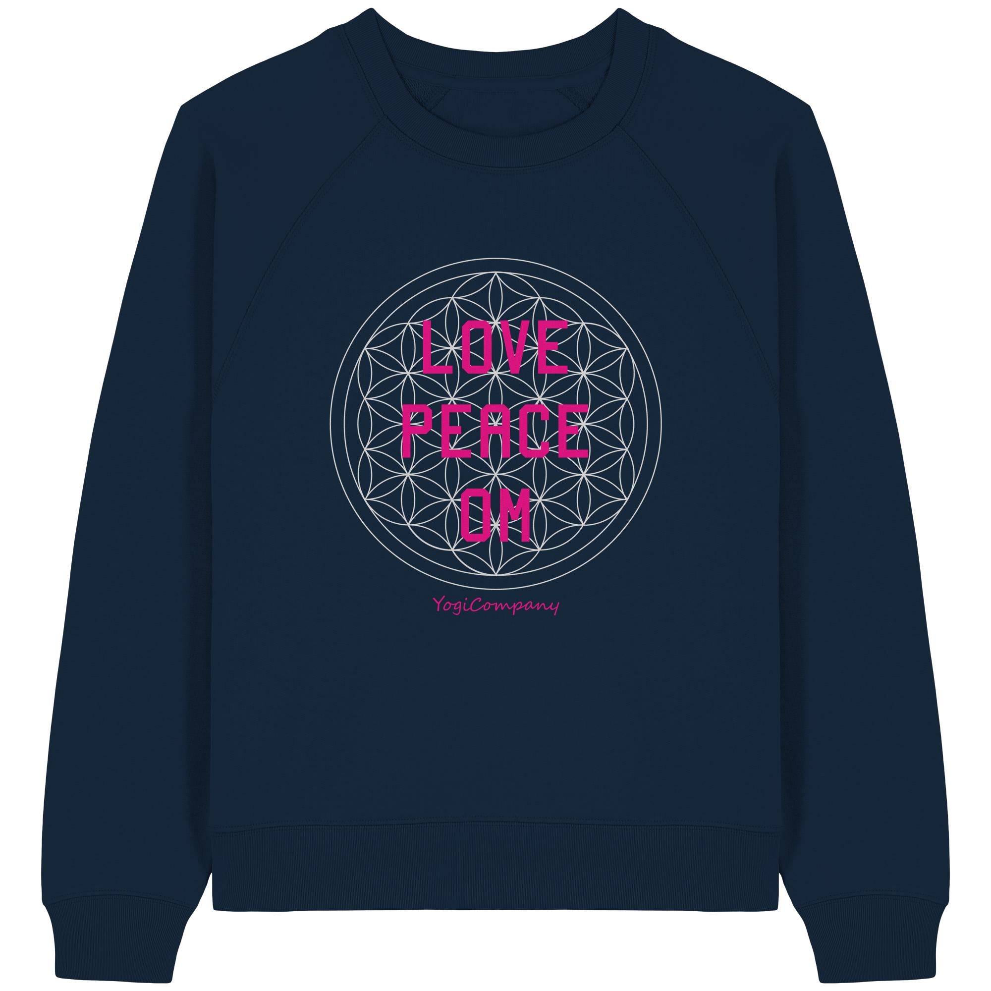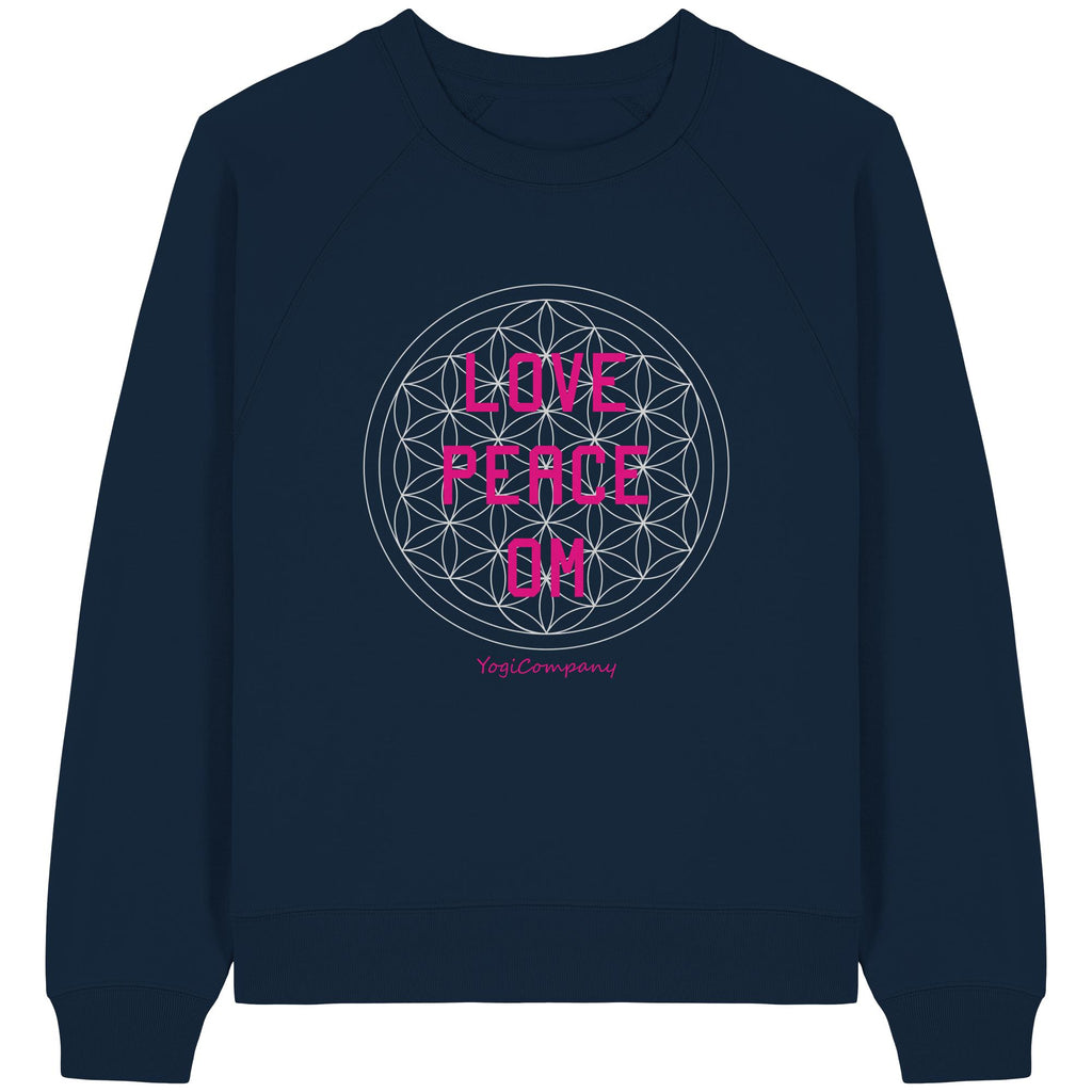 Dieses Design zeigt das Symbol der Blume des Lebens, verbunden mit den Worten "Love, Peace, Om".